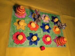c, Kaptárok versenye: A játékot 2 vagy 4 gyerek játszhatja. A játékosok elhelyezik a két kaptárt a nyilak melletti virágok közepére. A többi virágra ugyanúgy kupak kerül. A játéksok két csapatban gyűjtik be a nektárt a saját kaptárukba. Ahányat dobnak, annyit léphetnek. Ahova érkeztek, azt megnézhetik. Ha van alatta nektár, akkor vissza kell menni a kaptárhoz a kupakkal. Ha nagyobbat dobnak, mint amilyen messze van a kaptár, akkor belépnek a kaptárba és a többi lépés elvész. Az nyer, aki a játék végre a legtöbb nektárt gyűjtötte. A nektár nélküli kupakok felfordítás után.