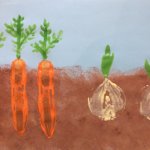 - A kép elkészítésének menete: A szivacsot jól átitattam a barna festékkel és felvittem a festéket nyomkodva a papír alsó felére. Félbe vágtam a zöldségeket. Befestettem a zöldségek vágott felét és a lapra nyomdáztam velük. (A hagyma színét sok fehérrel és egy kevés sárga festékkel értem el) A zöld festék és az ecset segítségével megfestettem a növények zöldjét. Lehet még gyökeret is festeni a zöldségeknek tűfilccel.