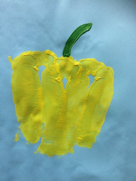 - A kép elkészítésének menete: A gyerekek befestik a kézfejük oldalát (kisujjtól a csuklóig). A jobb kézzel ökölbe szorítva középre és jobbra nyomdáznak, a bal kézzel pedig balra és középre kell nyomdázniuk. Ahhoz, hogy a kép éles legyen, minden egyes nyomdázás előtt újra kell festeni a kezet. Ha ez megvan, ecsettel húzzunk egy szárat a paprikának.